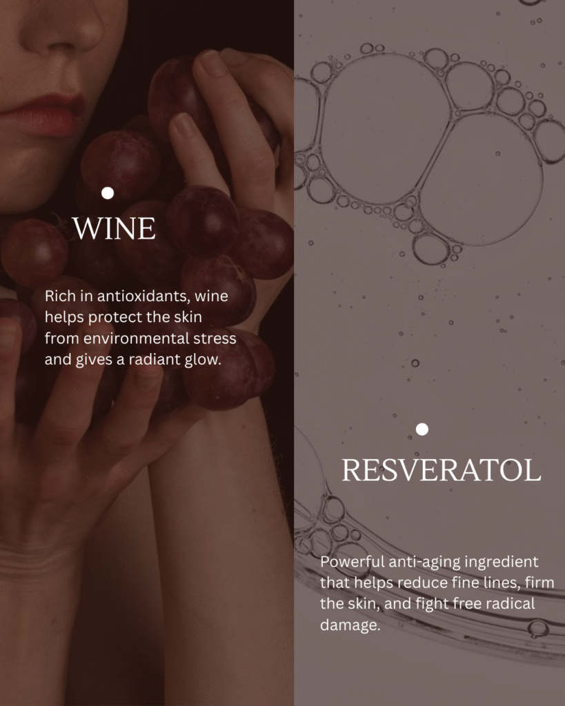 Vino therapy is a skincare method based on the idea that grapes contain some of the most powerful natural antioxidants available. The extracts derived from grapes are rich in resveratrol, polyphenols and flavonoids. These ingredients help defend the skin against oxidative stress, a condition in which harmful free radicals damage the skin’s structure. When oxidative stress increases, collagen breaks down faster, elasticity reduces and the skin begins to show premature signs of aging.